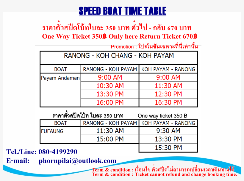 -Ranong: Dep 09:00 am. / 12:00 pm.