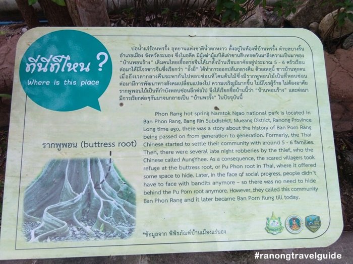 Phon Rang hot spring Ngao Waterfall National Park is located in Ban Phon Rang, Bang Rin subdistrict, Mueang district, Ranong province. Long time ago, There was a story about the history of Ban Porn Rang being passed on from generation to generation. Formerly, the Thai Chinese started to settle their community with around 5-6 families. Then, there were several late night robberies by the thief, who the Chinese called AungYhee or Chinese rebellion. As a consequence, the scared villagers took refuge at the buttress root,or Pu Phon root in Thai, where it offered some space to hide. Nowaday the villager don't have to hide form the danger, don't use "the buttress root" any more. Now we called this village is "Ban Phon Rang".