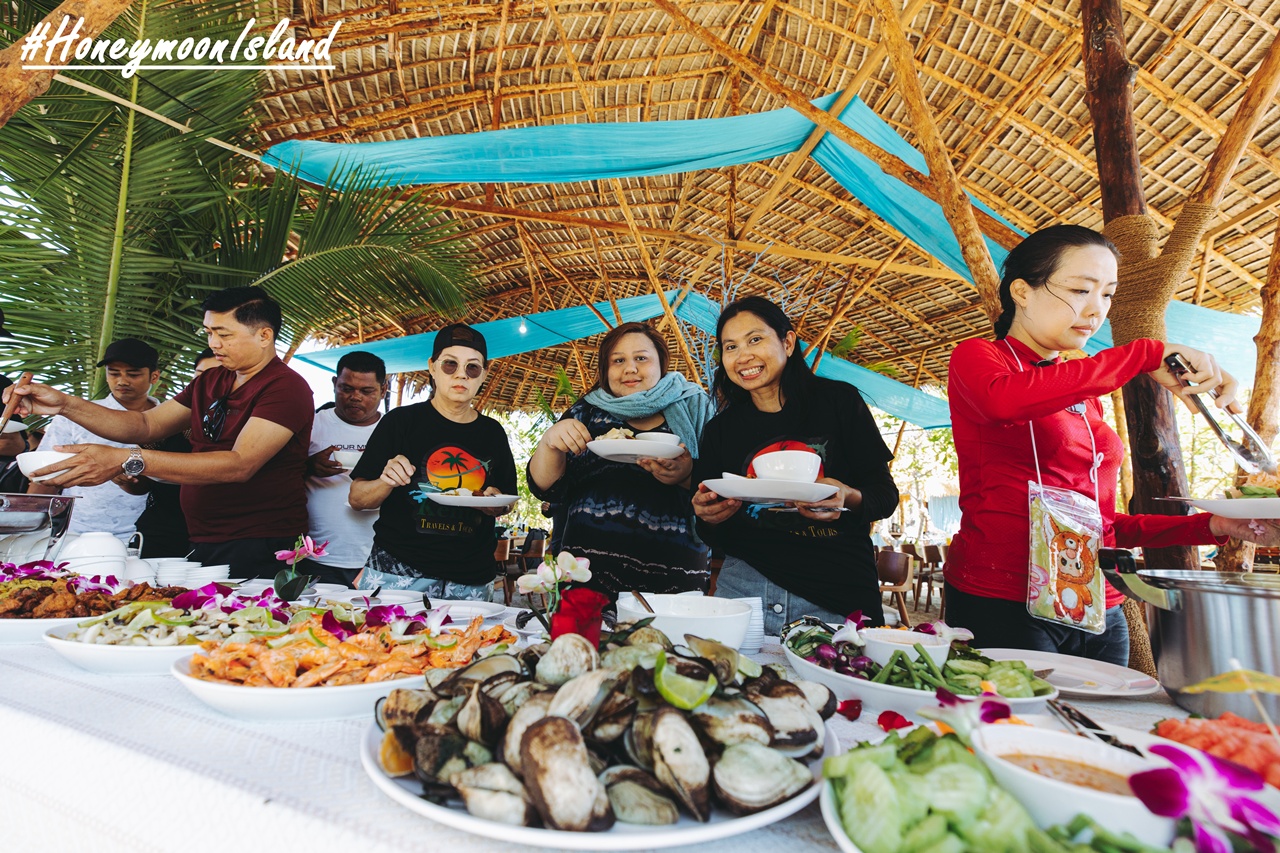 บนเกาะฮันนีมูน Honeymoon Island ทะเลพม่า บริการอาหารบุฟเฟ่ต์ มื้อเที่ยงด้วยอาหารทะเล และอาหารไทยท้องถิ่น หรืออาจมีซุปมันฝรั่งแบบสไตล์พม่า เสริฟอีกด้วย มีชา กาแฟ ให้ดื่มอุ่นๆ ผลไม้ตามฤดูกาล