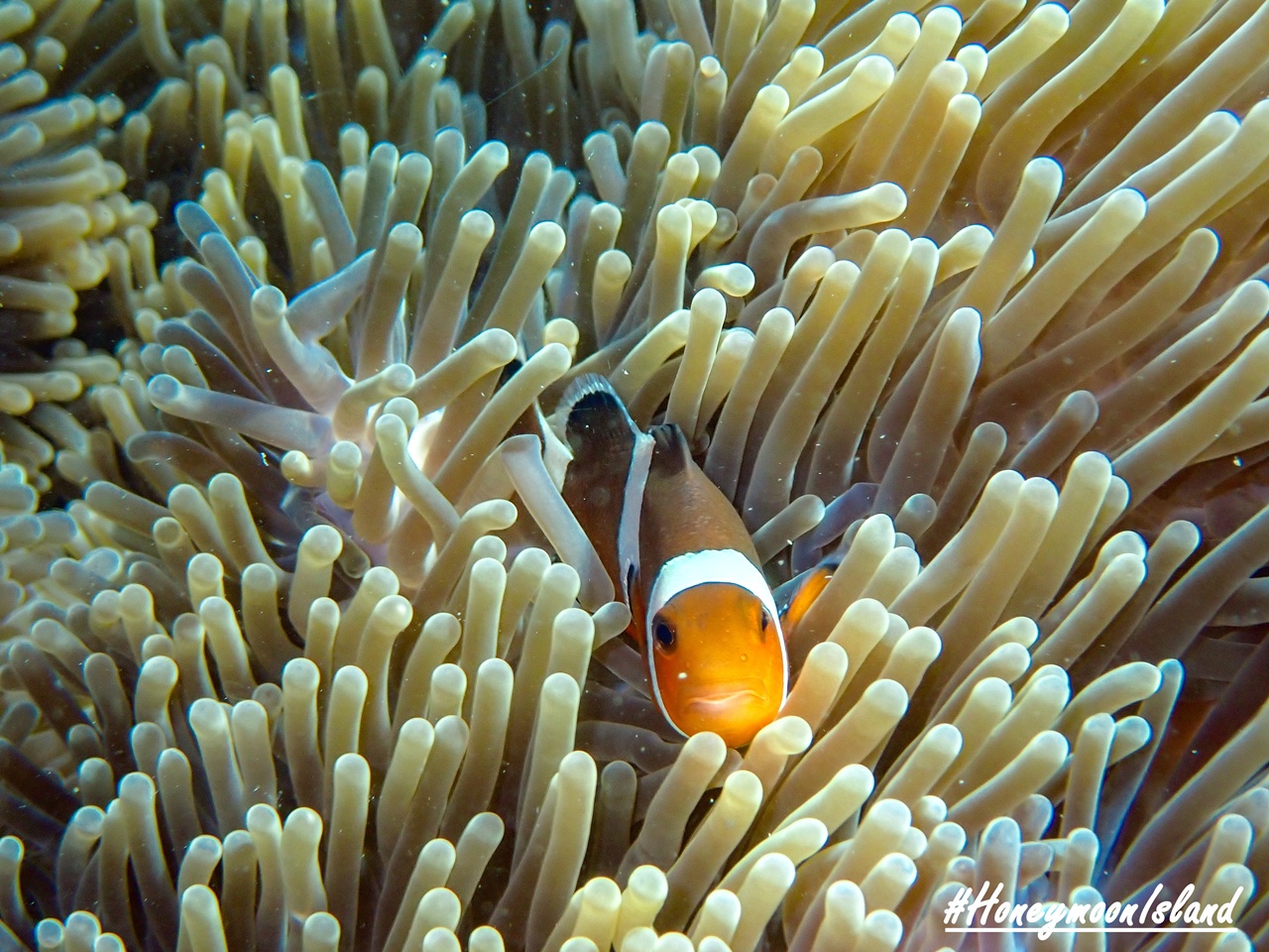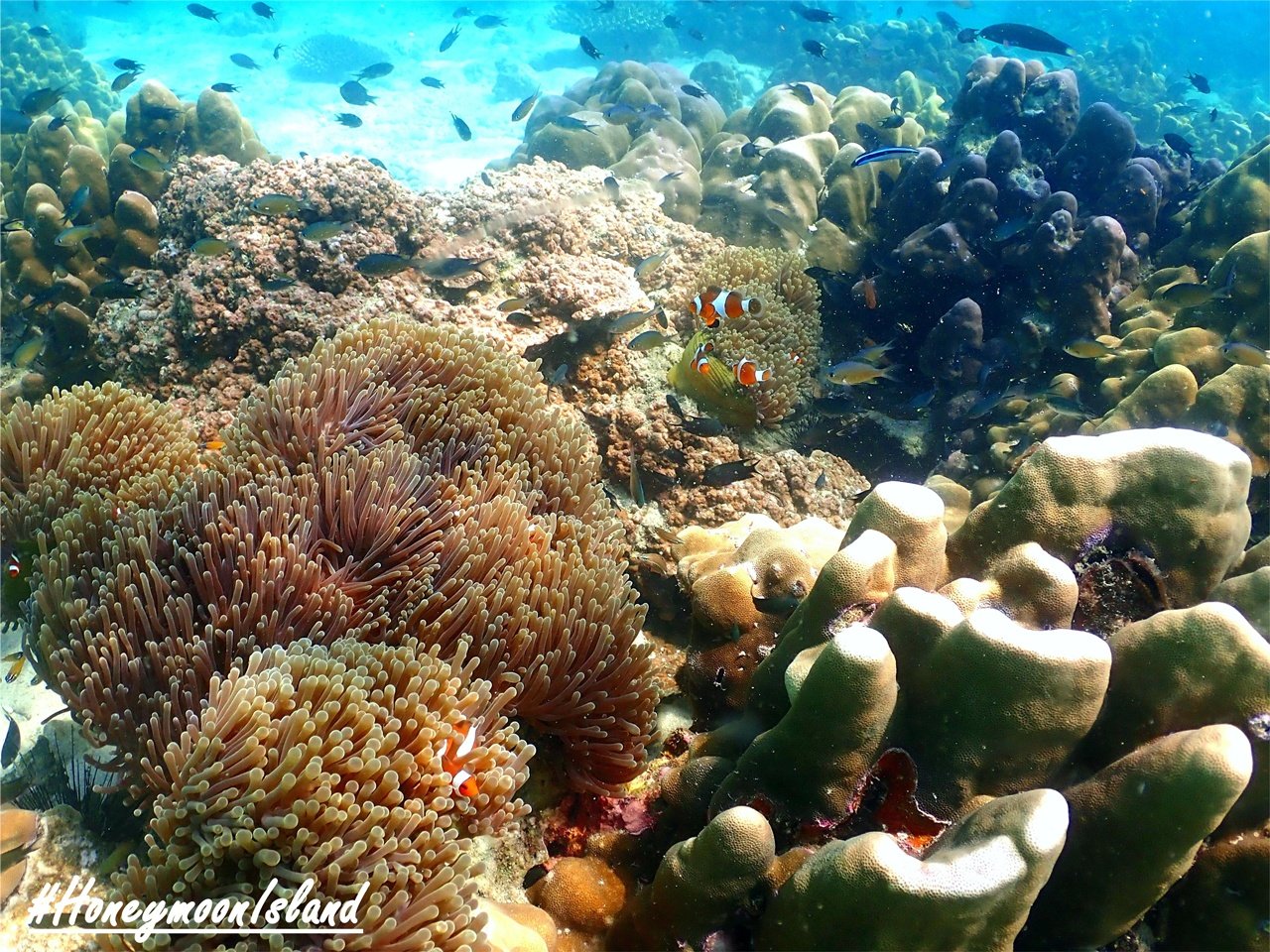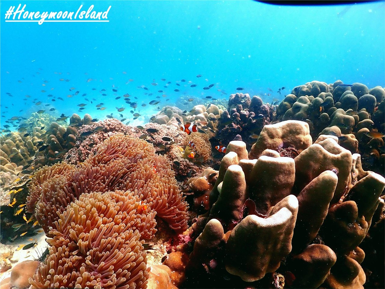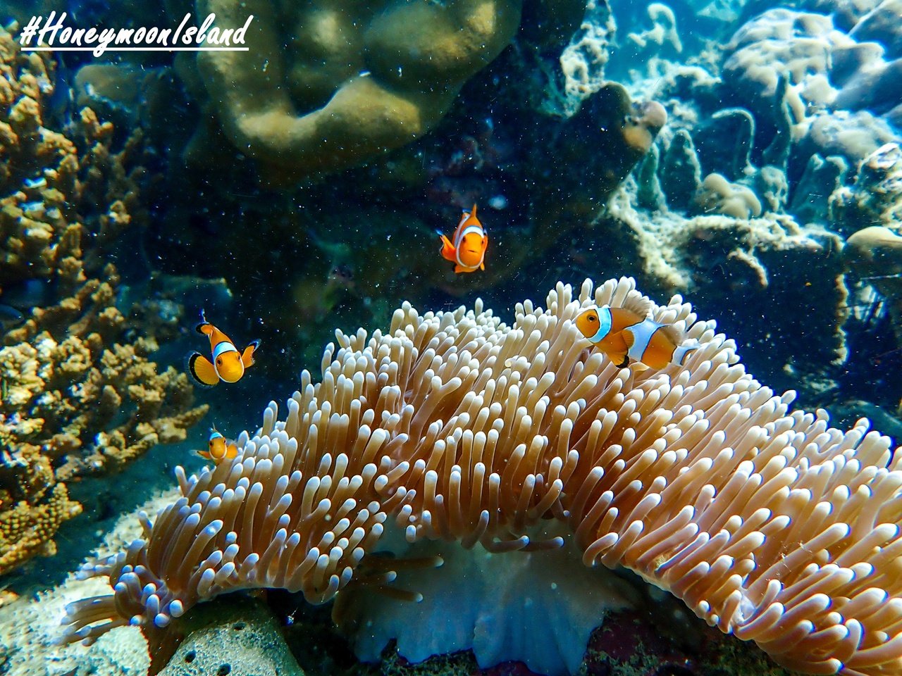 น้ำที่ใสราวกระจก ของเกาะฮันนีมูน เป็น Snorkeling Paradise ของการดำน้ำดูแนวปะการังชายหาดที่น่าสนใจ มีบ้านของปลานีโม่ หรือปลากาตูนหลากสายพันธุ์ กอดอกไม้ทะเลที่มากมายเป็นพุ่มๆ